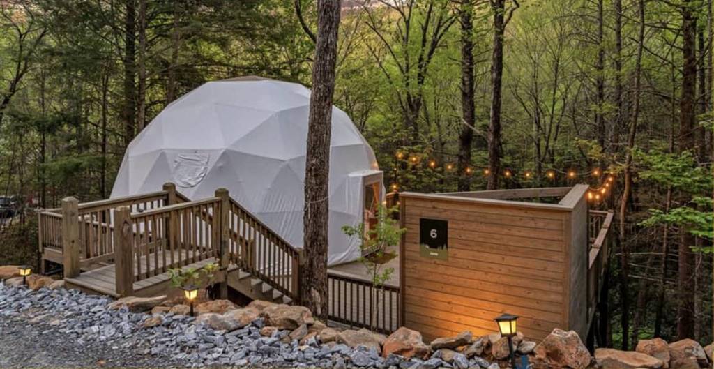 Y se vuelve aún más mágico… Las cúpulas se encuentran justo sobre la cascada, que Glamp Blue Ridgeilumina porla noche. Dicen: